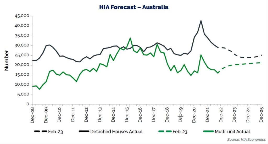 According to a recent HIA media release, the number of detached houses commencing construction is set to decline this year to its lowest level since 2012. This will see the number of detached housing starts fall below 100,000 starts per year for the first time in a decade to just 96,300 in 2024. This is a very rapid slowdown from the 149,000 starts in 2021. (HIA Media Release 21 February 2023)