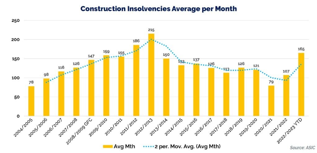 What a difference a year makes! This time last year, and despite a number of high-profile company collapses which sent shockwaves through the industry, overall insolvency numbers remained relatively low. Insolvency numbers fell quite sharply from June 2020 and remained relatively low until the second half of 2022. (see graph below). However, insolvency experts were warning that the construction industry was a “bubble waiting to burst”.